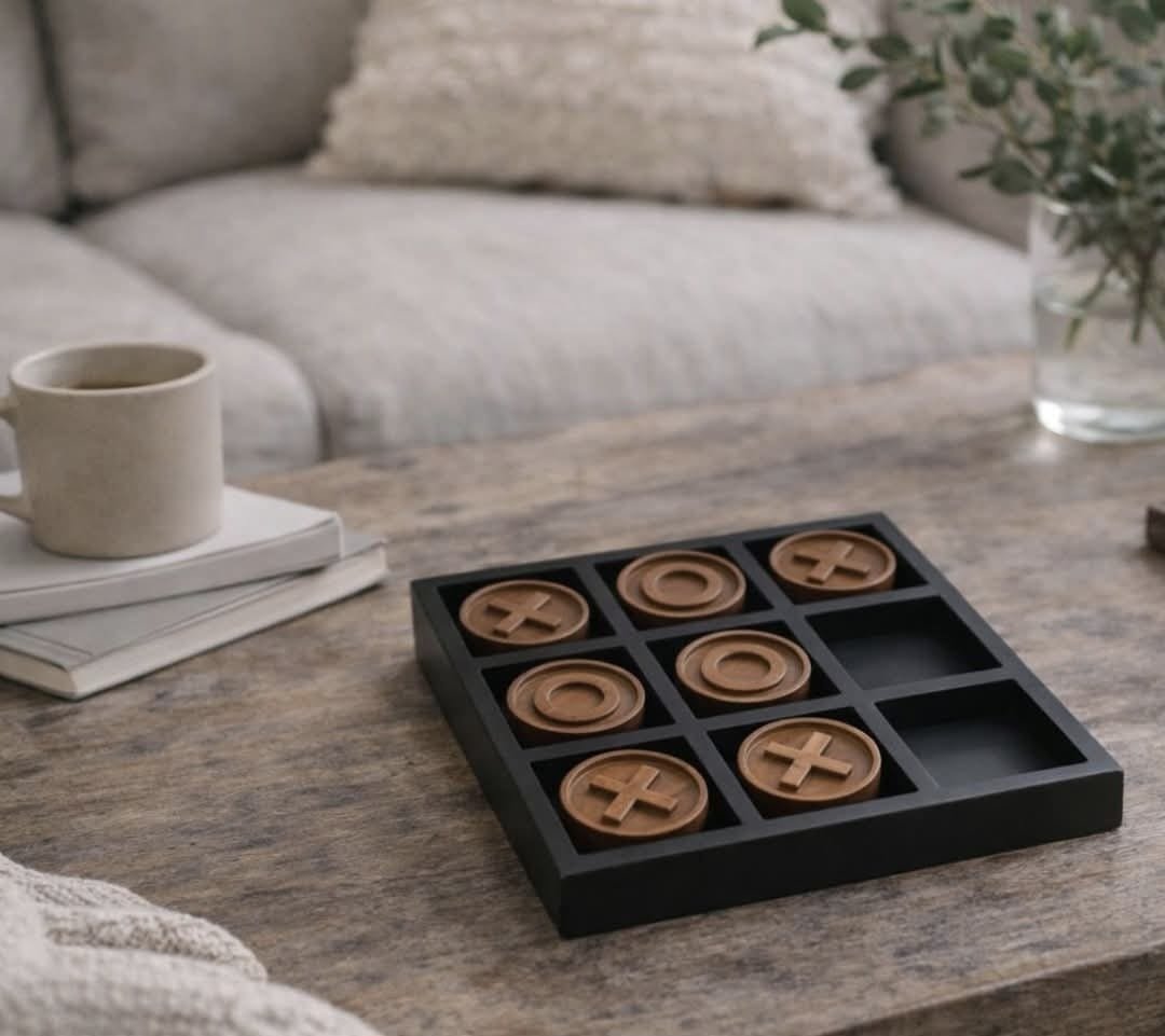 משחק איקס עיגול בעיצוב מודרני: משחק איקס עיגול בעיצוב מודרני ונועז המשלב מסגרת שחורה עם כלי משחק מעץ טבעי בגוון חמים הניגודיות בין השחור העמוק לעץ יוצרת מראה יוקרתי ומדויק עם נוכחות מרשימה
