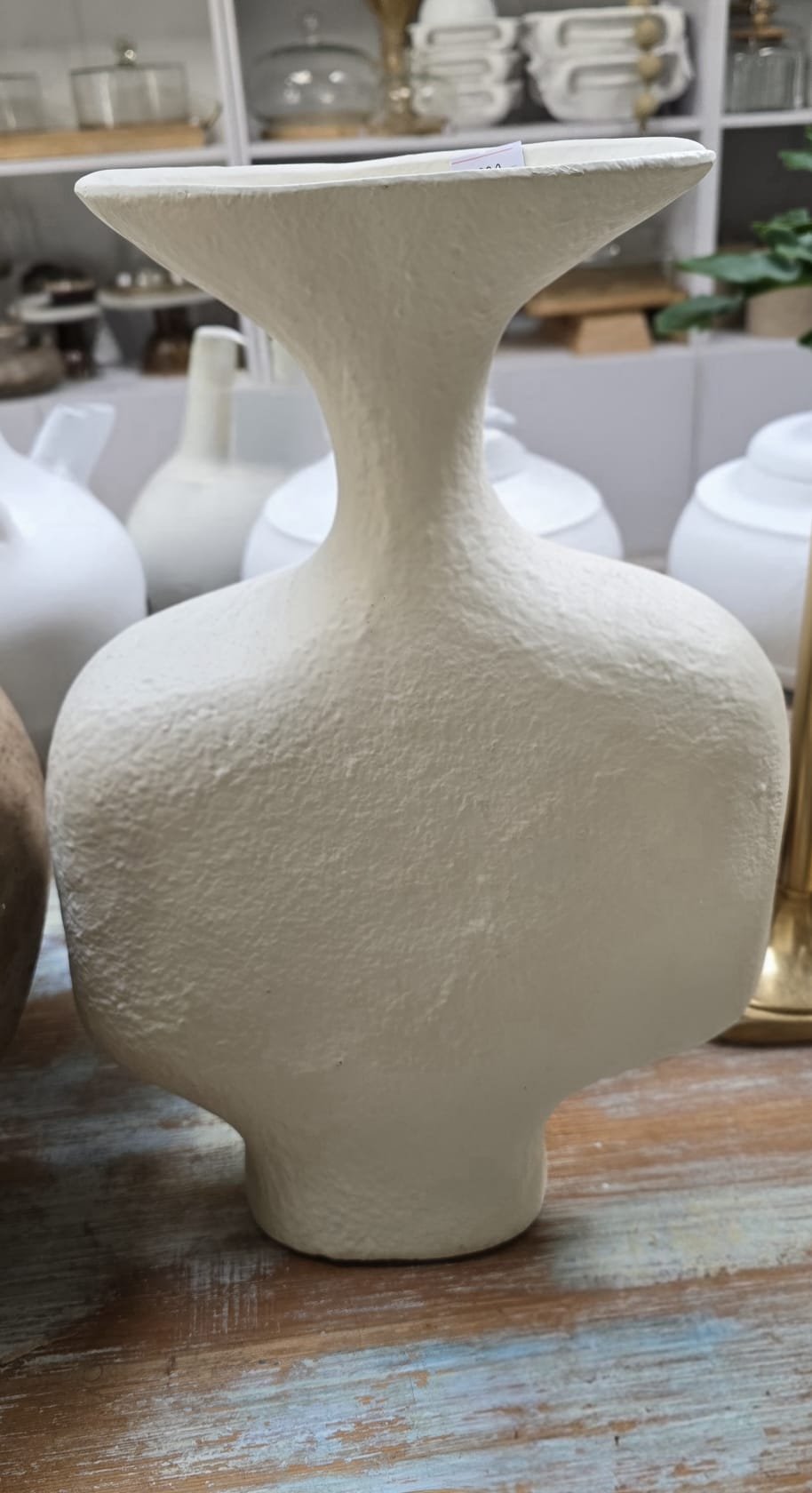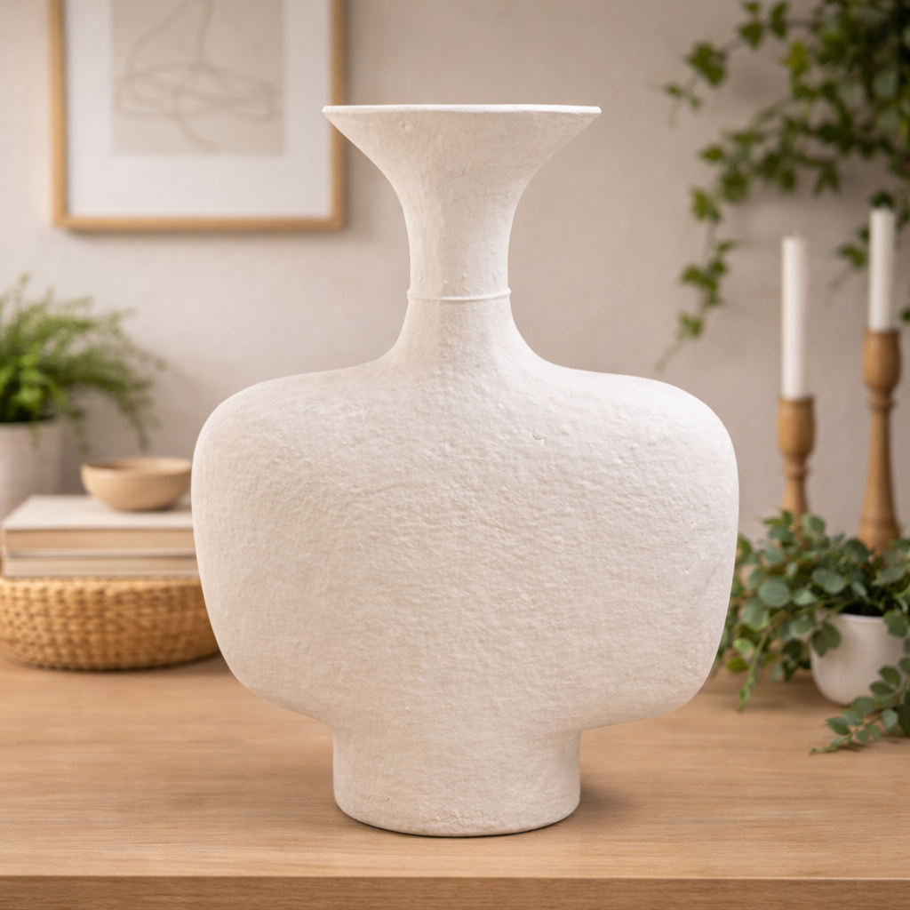 כד לבן גדול בעיצוב פיסולי, בגימור מט וטקסטורה טבעית המעניקים לו מראה אלגנטי ועל־זמני. מתאים לשילוב על שידה, מדף או שולחן צד, ומוסיף נגיעה עדינה וחמימה לעיצוב הבית.