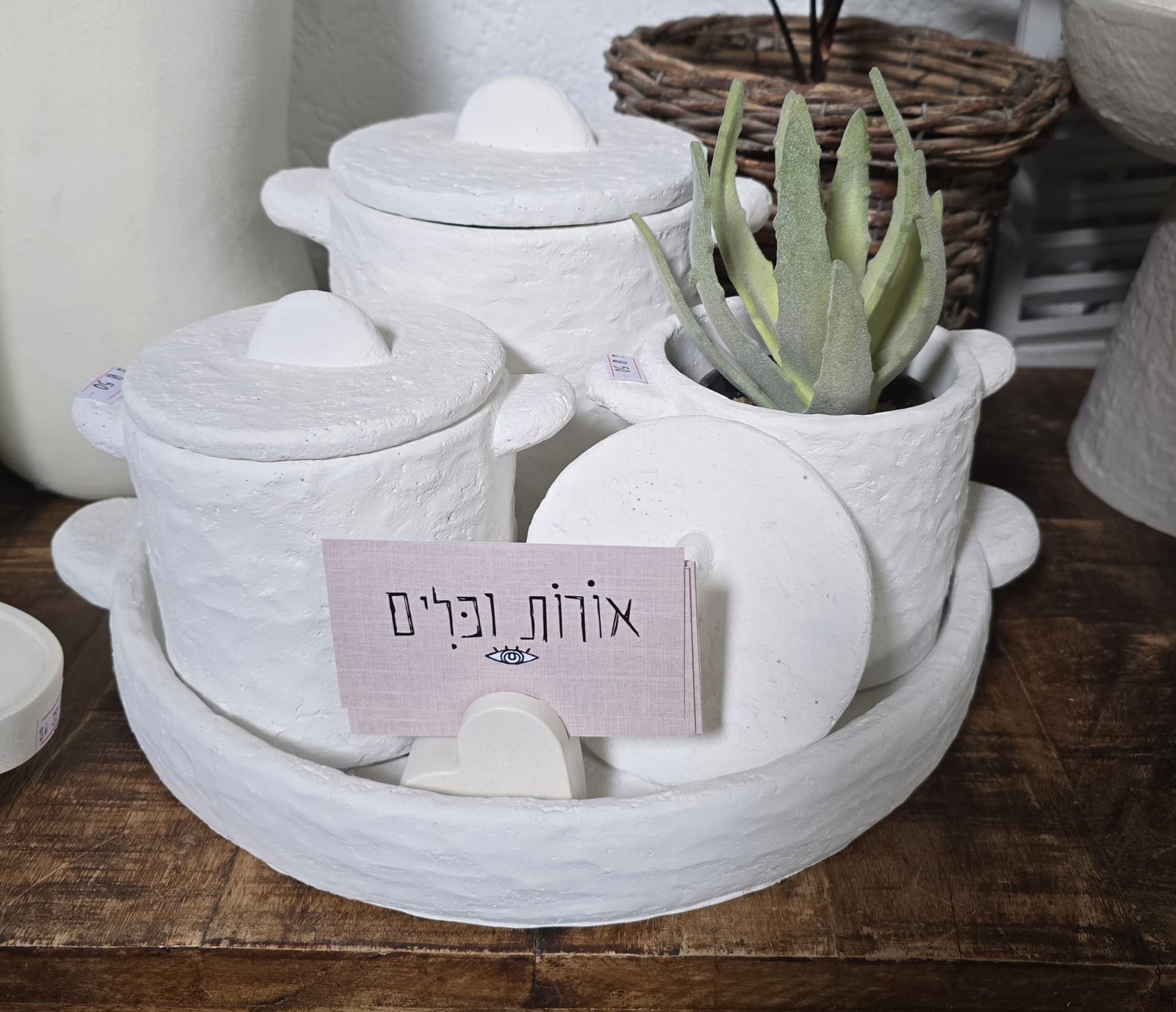 כלי בטון לבן בעבודת יד, בגימור מחוספס וטקסטורה טבעית המעניקים לו מראה נקי ועל־זמני. מתאים לאחסון דקורטיבי, לצמחייה קטנה או לפריטי עיצוב, ומשתלב בצורה מושלמת בעיצוב ביתי חמים ומודרני.
