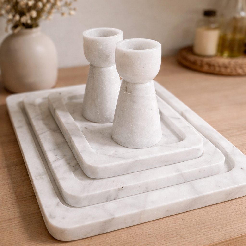 מגש שיש לבן בעיצוב מינימליסטי, בגימור חלק וקווים נקיים המבליטים את הטקסטורה הטבעית של האבן. אידיאלי לסידור נרות, אביזרי אמבט או פריטי דקורציה, ומשתלב באופן מושלם בעיצוב ביתי אלגנטי ומעודכן.