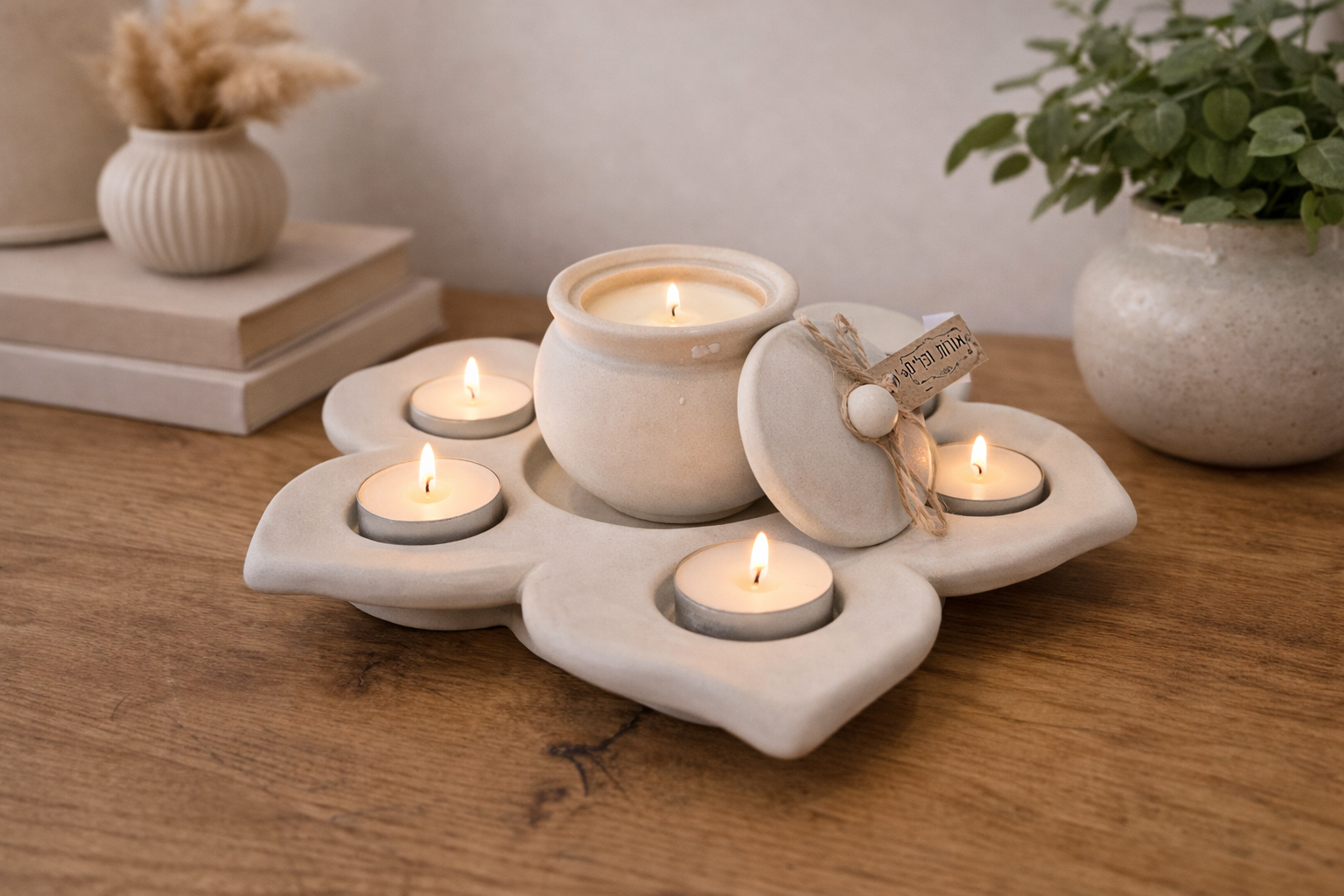 מגש פרח לוטוס מעוצב מבטון בעבודת יד, עם נר מרכזי ושישה נרות בעלי כותרת, מבושמים בניחוחות המדבר. פריט דקורטיבי ייחודי שמכניס רוגע, חמימות ואווירה טבעית לכל חלל בבית.