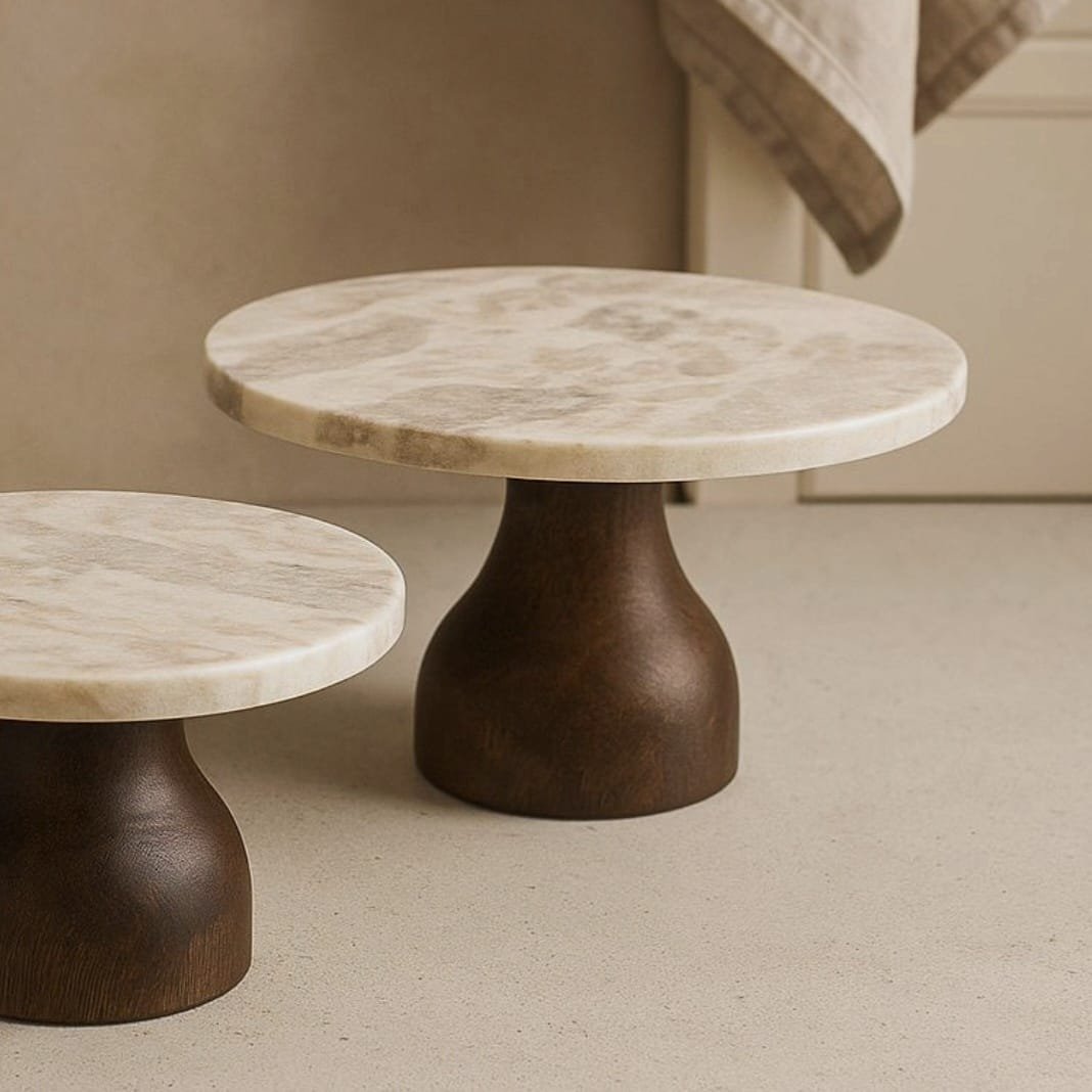סטנד הגשה שיש + רגל עץ גדול: סט מגשי הגשה עגולים עם בסיס עץ כהה ומשטח שיש טבעי מתאימים להגשה אלגנטית ושילוב חומרים יוקרתי המוסיף אופי לשולחן