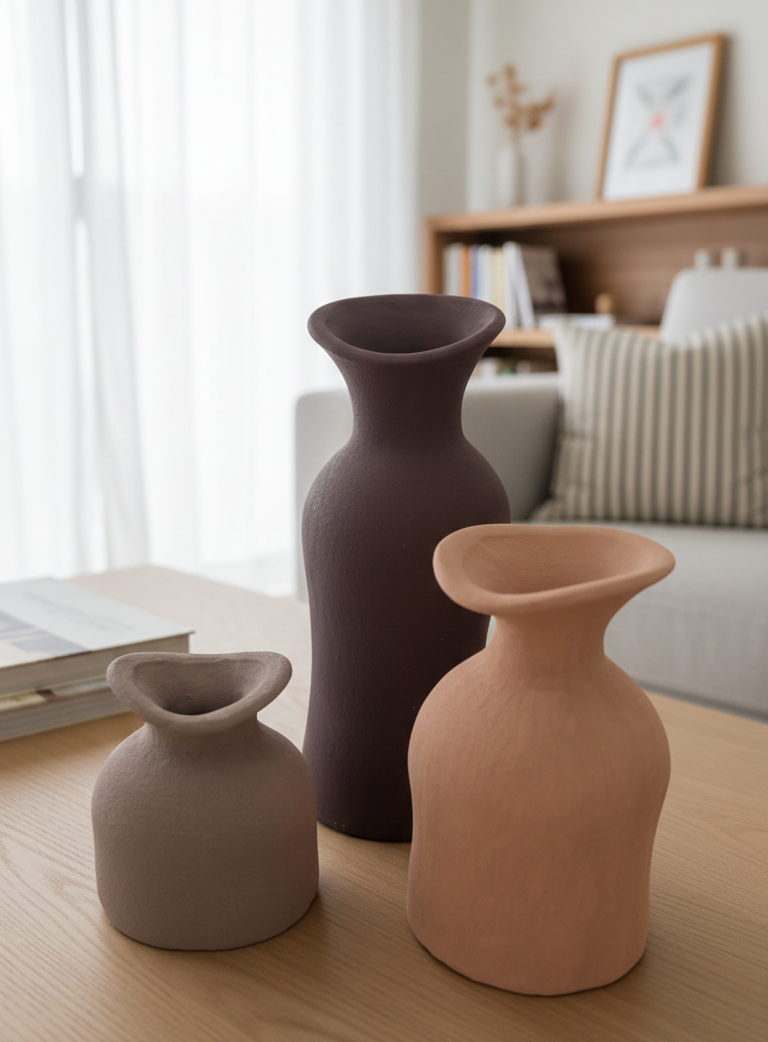 סט של שלושה כדים: סט של שלושה כדים בגימור טבעי ומרקם עדין בעיצוב רך ופיסולי שילוב הרמוני של גבהים וצורות היוצר מראה שקט אלגנטי ועל זמני המתאים להנחה יחד או בנפרד על מדף קונסולה או שולחן למגע עיצובי חם ומודרני