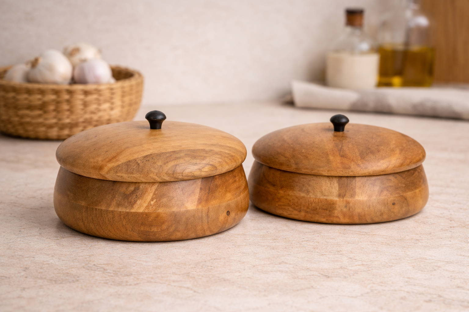 קופסת אחסון מעץ טבעי, בגוון חום-דבש חמים ובטקסטורה טבעית המדגישה את יופיו של העץ. עיצוב עגול ונקי עם מכסה תואם, אידיאלית לאחסון דקורטיבי על מדף, שידה או שולחן, ומשתלבת בקלות בעיצוב ביתי חמים ועל־זמני