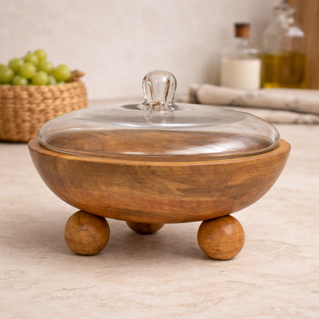 קערת עץ גדולה עם מכסה זכוכית, בעיצוב טבעי ואלגנטי על רגליות עץ עגולות. משלבת פונקציונליות ודקורטיביות, אידיאלית להגשה, אחסון או הצגת פריטים, ומוסיפה חמימות וסטייל לכל חלל ביתי.