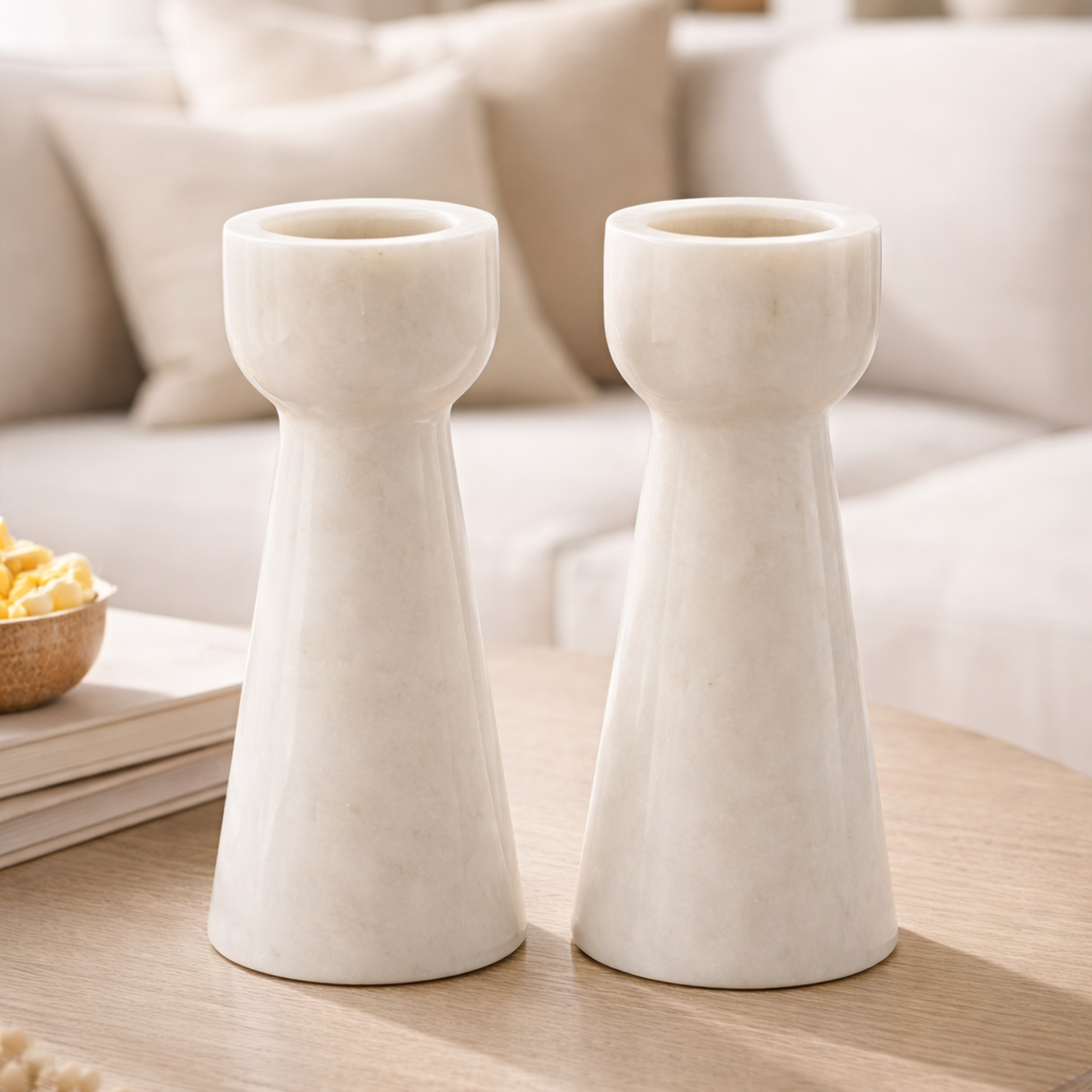 פמוט עשוי שיש טבעי בגימור חלק ונעים, בעיצוב על-זמני שמשתלב בהרמוניה בכל חלל. מעניק נוכחות אלגנטית ואווירה חמימה – מושלם לשולחן אוכל, מדף או פינת סלון.